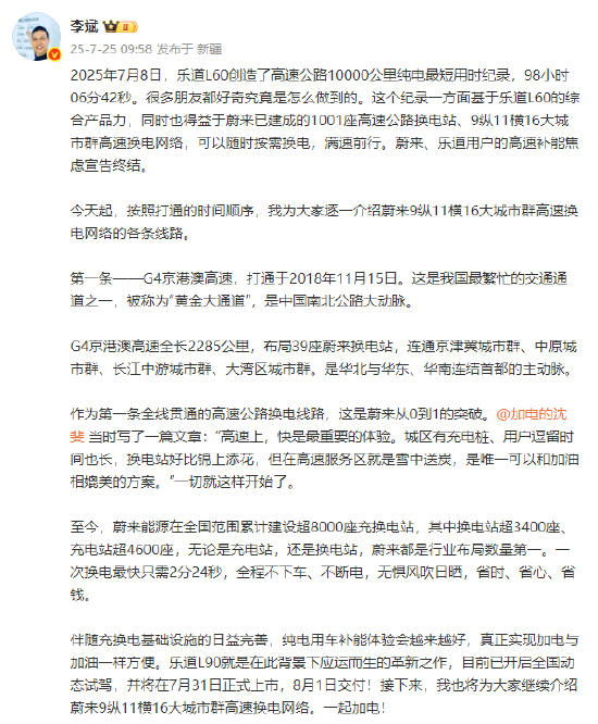 7月25日,蔚来创始人、董事长、CEO李斌发微博表示,蔚来、乐道用户的高速补能焦虑宣告终结。